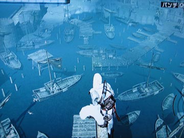 市民救出、もしくはスリや暗殺の失敗など、「アサシンダー」と衛兵に見付かればたちまちその場は大混戦。アルタイルはロングソード、ショートソード、アサシンブレードを使って戦いますが、コンボ・キルやカウンターが決まると殺陣のように格好いいアクションになるので必見です。アクションは基本的には攻撃ボタンをタイミング良く押すだけというヘタにも優しい簡単仕様で、振りが大きいのでタイミングを計りやすいロングソード、リーチは短いが素早い振りのショートソード、決まればクリティカルのアサシンブレードを使い分けるのも面白い。アサシンブレードのカウンターは、決めるのが難しい分、決まったときは爽快です。水芸のように飛び散る血飛沫はイルブリード並に派手で、この辺は流石にZ指定のゲーム。