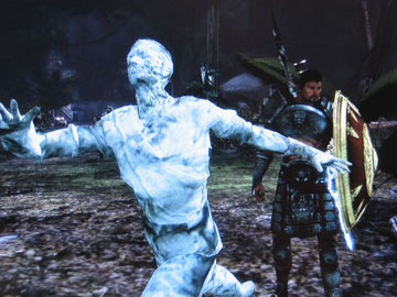 第一段階のペリアスは、空中でイアソンに向かってビームを撃ちますが、これは盾でガードし槍投げで反撃します。光るガイコツがイアソンの周りに発生し、触れるとダメージを喰らうので、動いて回避します(一遍に全部食らうとほぼ即死)。
