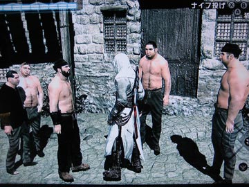 市民救出、もしくはスリや暗殺の失敗など、「アサシンダー」と衛兵に見付かればたちまちその場は大混戦。アルタイルはロングソード、ショートソード、アサシンブレードを使って戦いますが、コンボ・キルやカウンターが決まると殺陣のように格好いいアクションになるので必見です。アクションは基本的には攻撃ボタンをタイミング良く押すだけというヘタにも優しい簡単仕様で、振りが大きいのでタイミングを計りやすいロングソード、リーチは短いが素早い振りのショートソード、決まればクリティカルのアサシンブレードを使い分けるのも面白い。アサシンブレードのカウンターは、決めるのが難しい分、決まったときは爽快です。水芸のように飛び散る血飛沫はイルブリード並に派手で、この辺は流石にZ指定のゲーム。