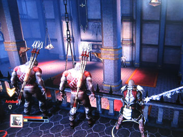 ところで、両手持ち主人公では初回はArishokを割と楽に倒せたのに、再プレイでは結構苦労しました。というのも、Arishokが壁際にいる時に近付いて、うっかり腹に剣を突き刺す技を食らうと、壁を突き抜けて2階に出てしまうことがあるからです。勿論こうなると下に降りられないのでリロードしかありません。後ちょっと削れば、のところで2階へ移動させられると結構泣けます。