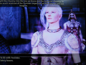 主人公達は村の中にある礼拝堂で、この場所を守る人物に引き合わされます。先日もdarkspawnの襲撃があったこと、今夜の襲撃に備えていることを聞かされ、主人公達もここで戦うことにします。1回目のプレイはほどほどに熱血な善人キャラ設定なので、選択肢も「報酬は要りません、困っている人を助けるのは自分達の義務です」みたいな勇者系選択肢を選んでいる…はず。